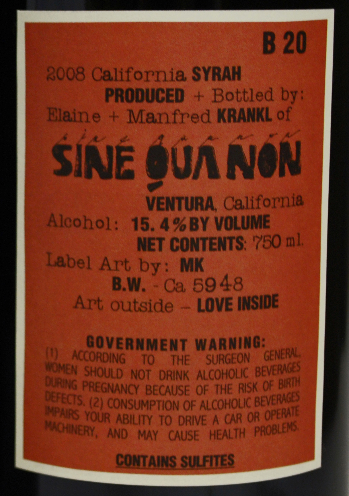 B-20 2008 Syrah was part of the same offer and shipment as THE Line 2008 Grenache.