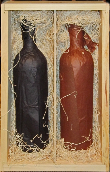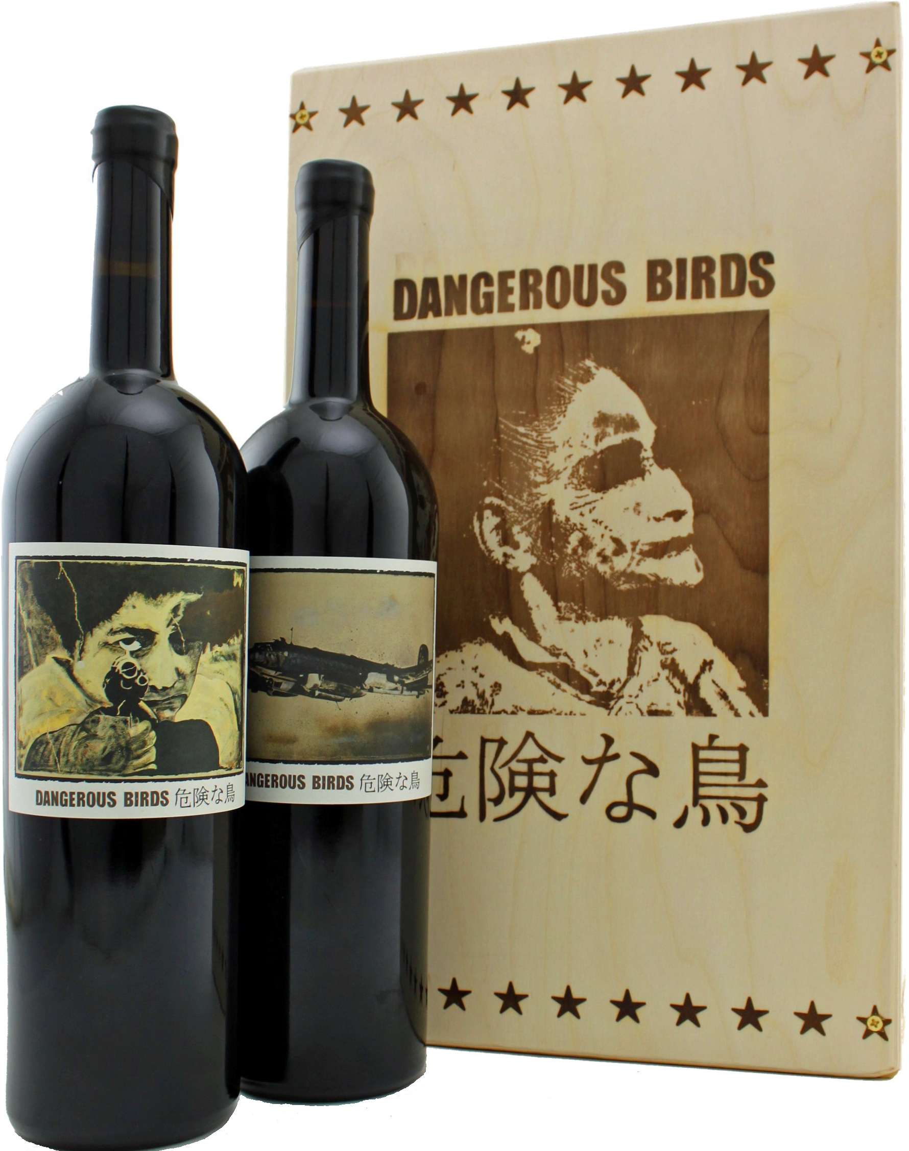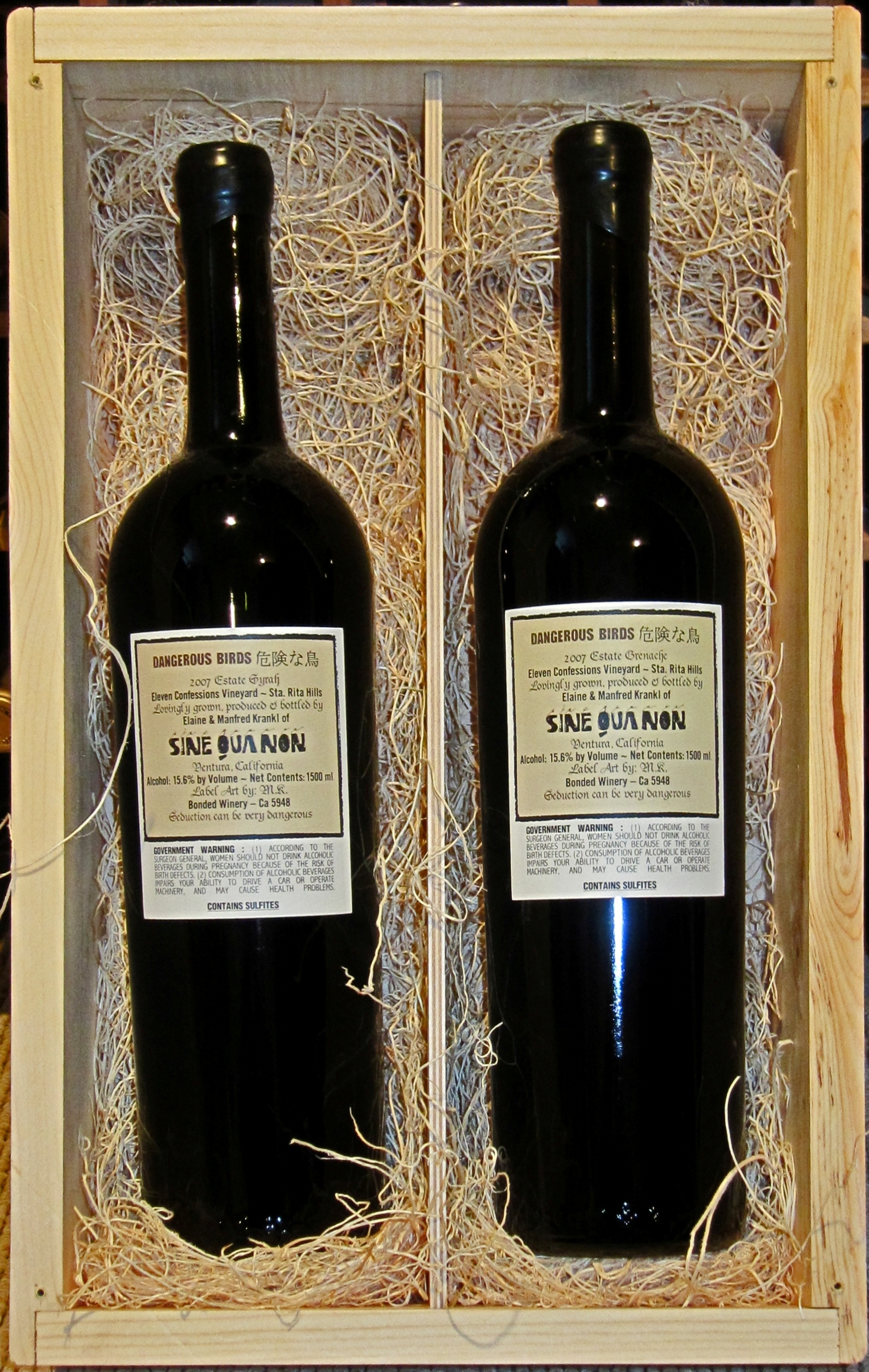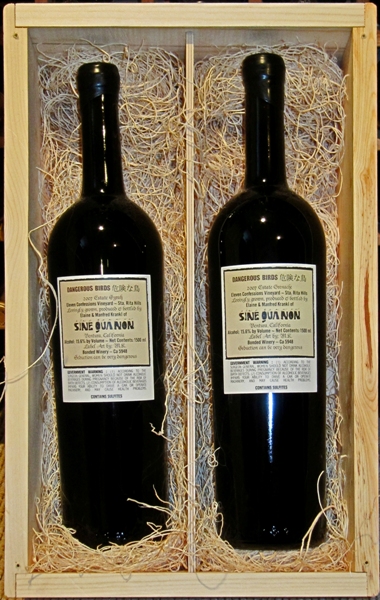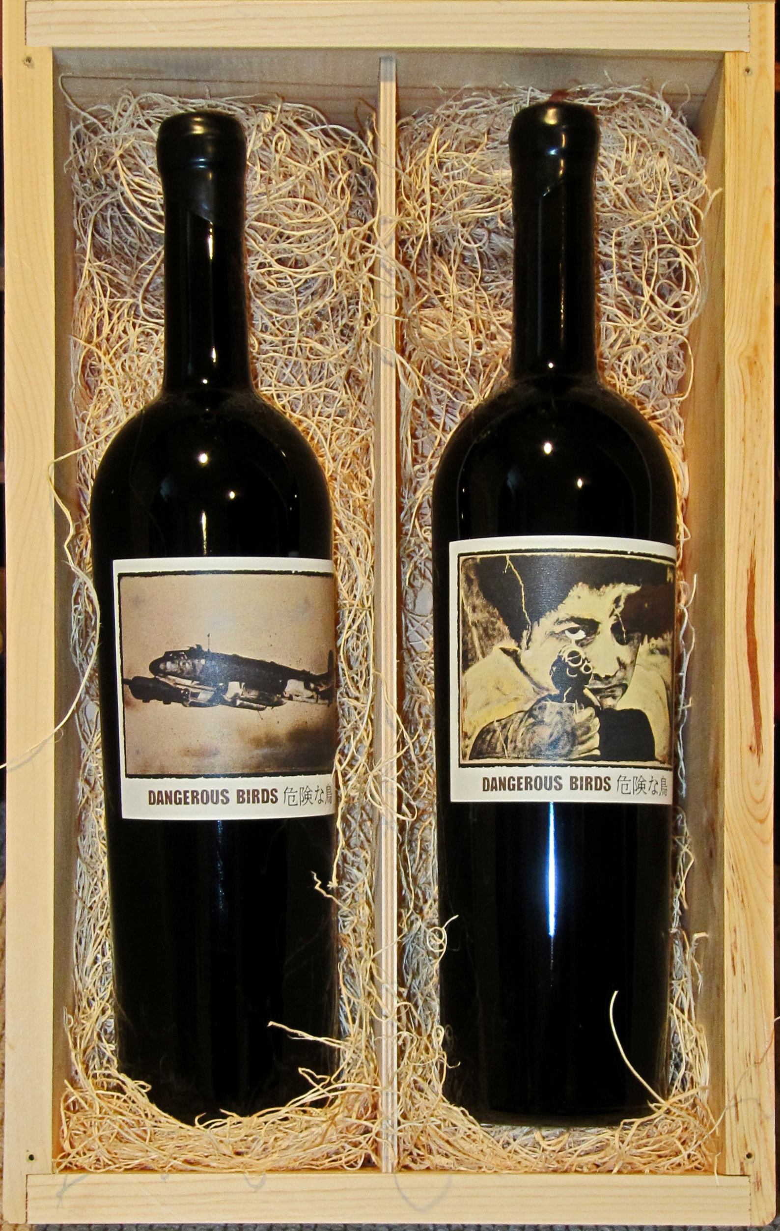 Magnums of Dangerous Birds were sold in a wood-boxed set containing one Syrah (left) and one Grenache (right).