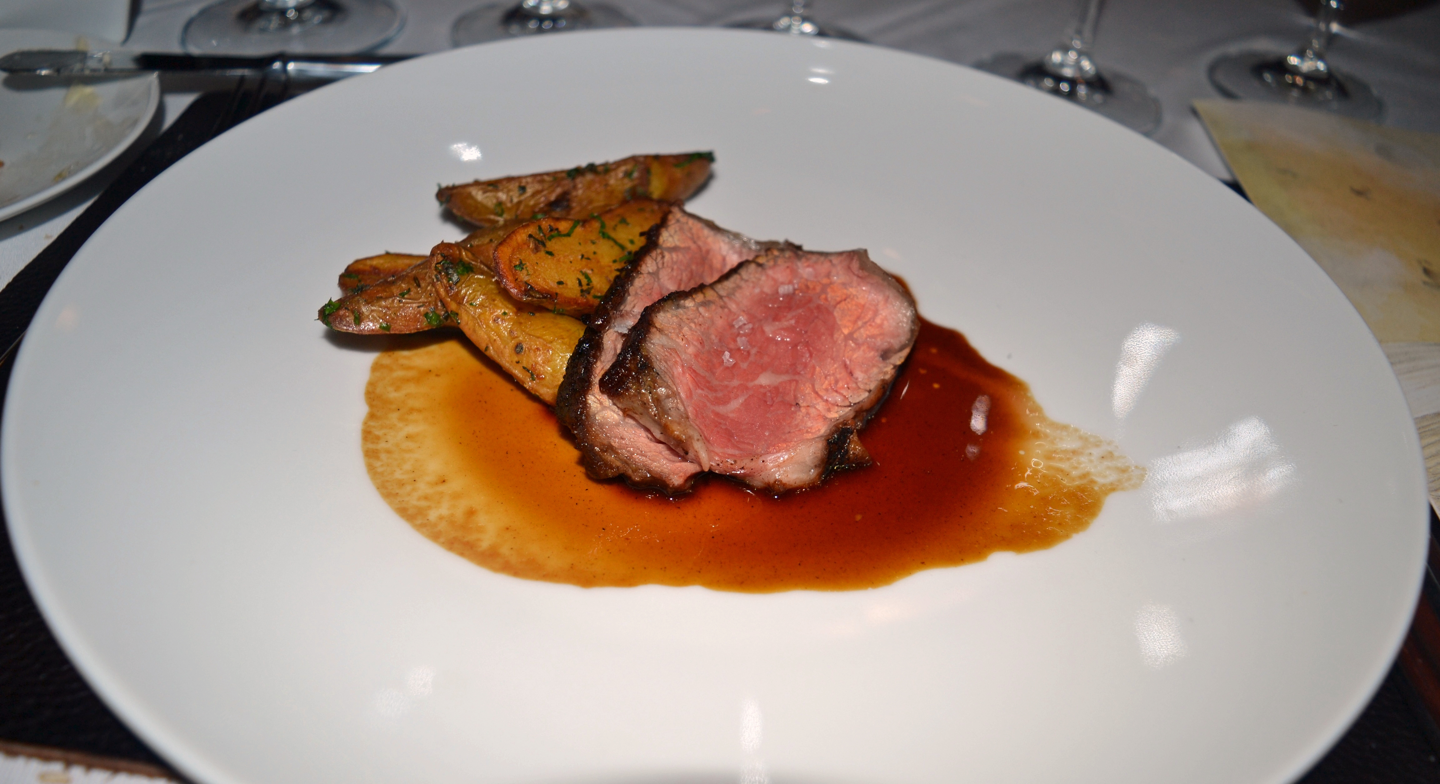 Prime Ribeye Steak, Duck Fat Fingerling Potatoes, Sauce Bordelaise.