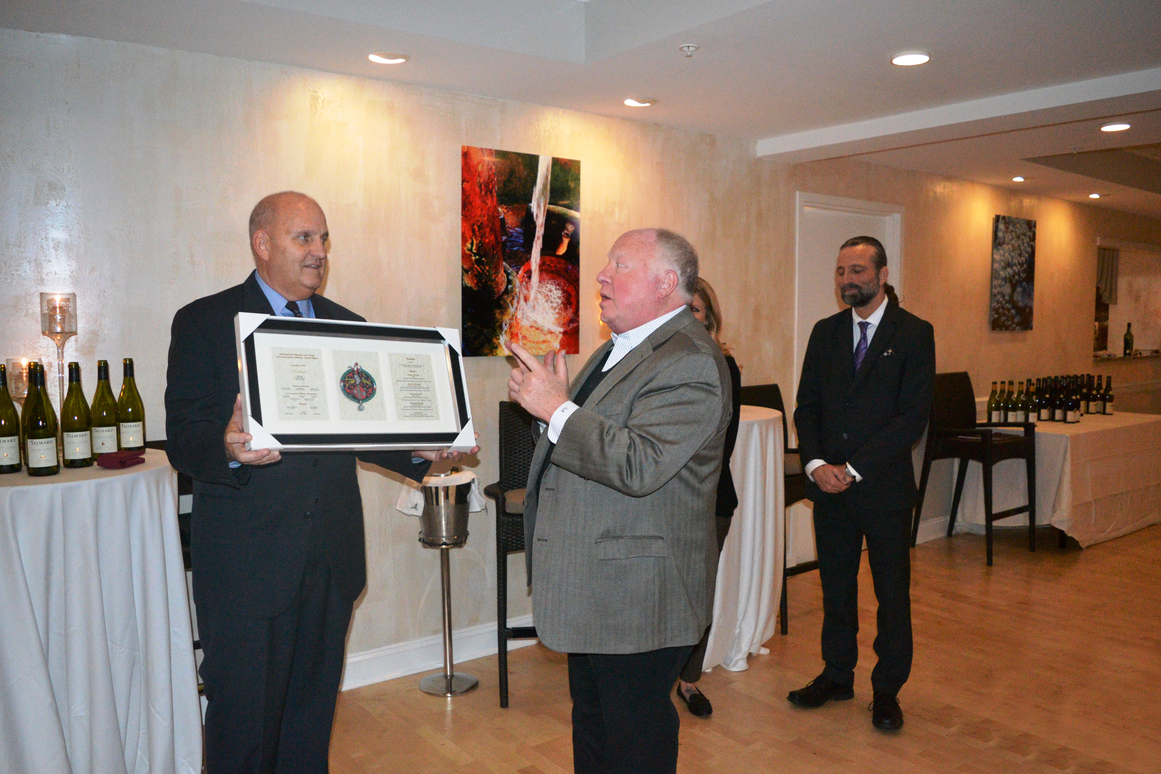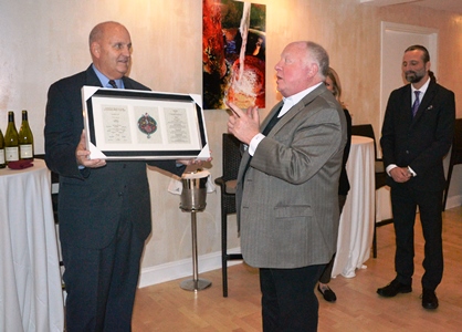 Joel Hodes presents a memento to Special Events Director Patrick Kelly (left)