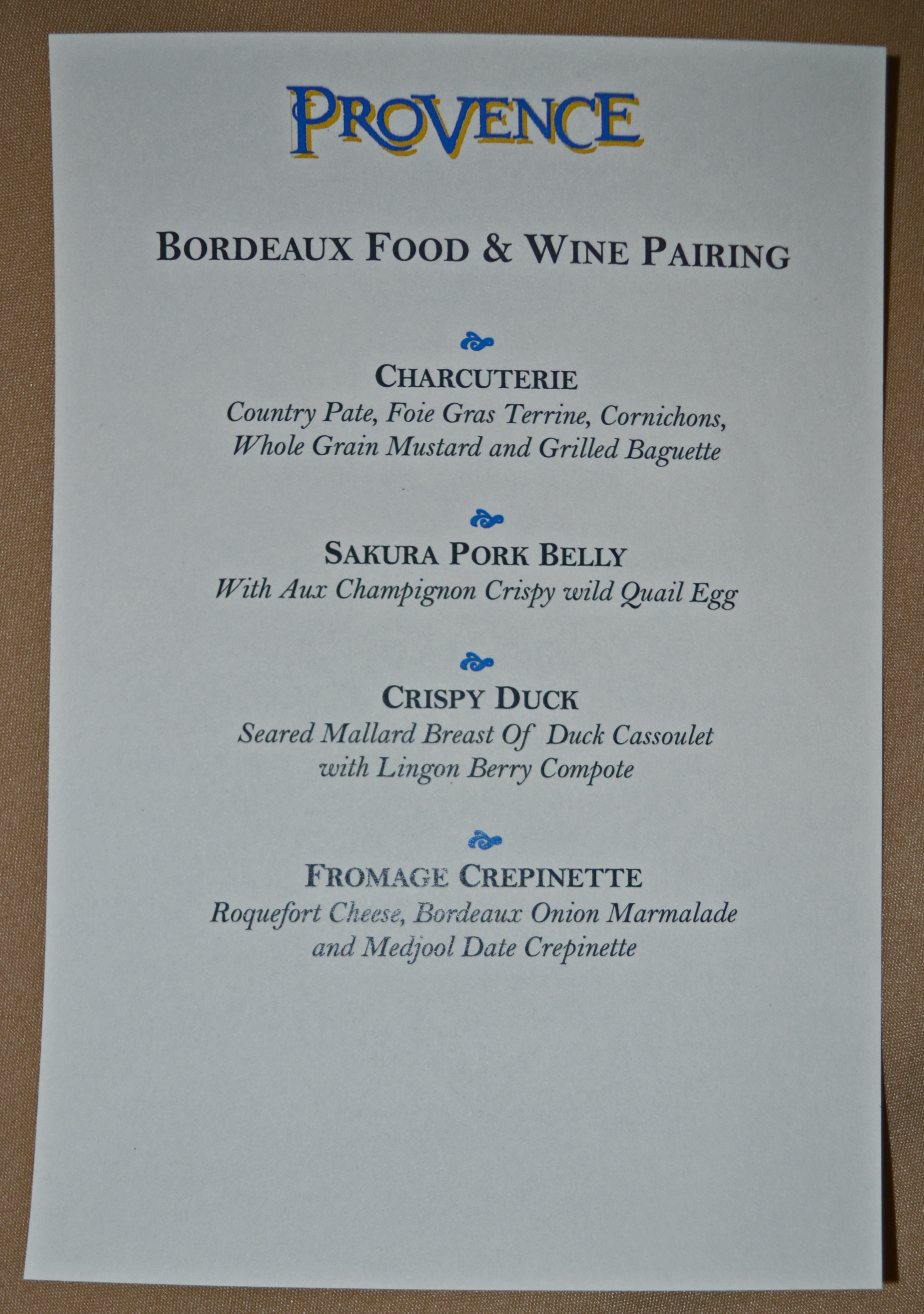 The food was very good and generally well-matched to the wines.