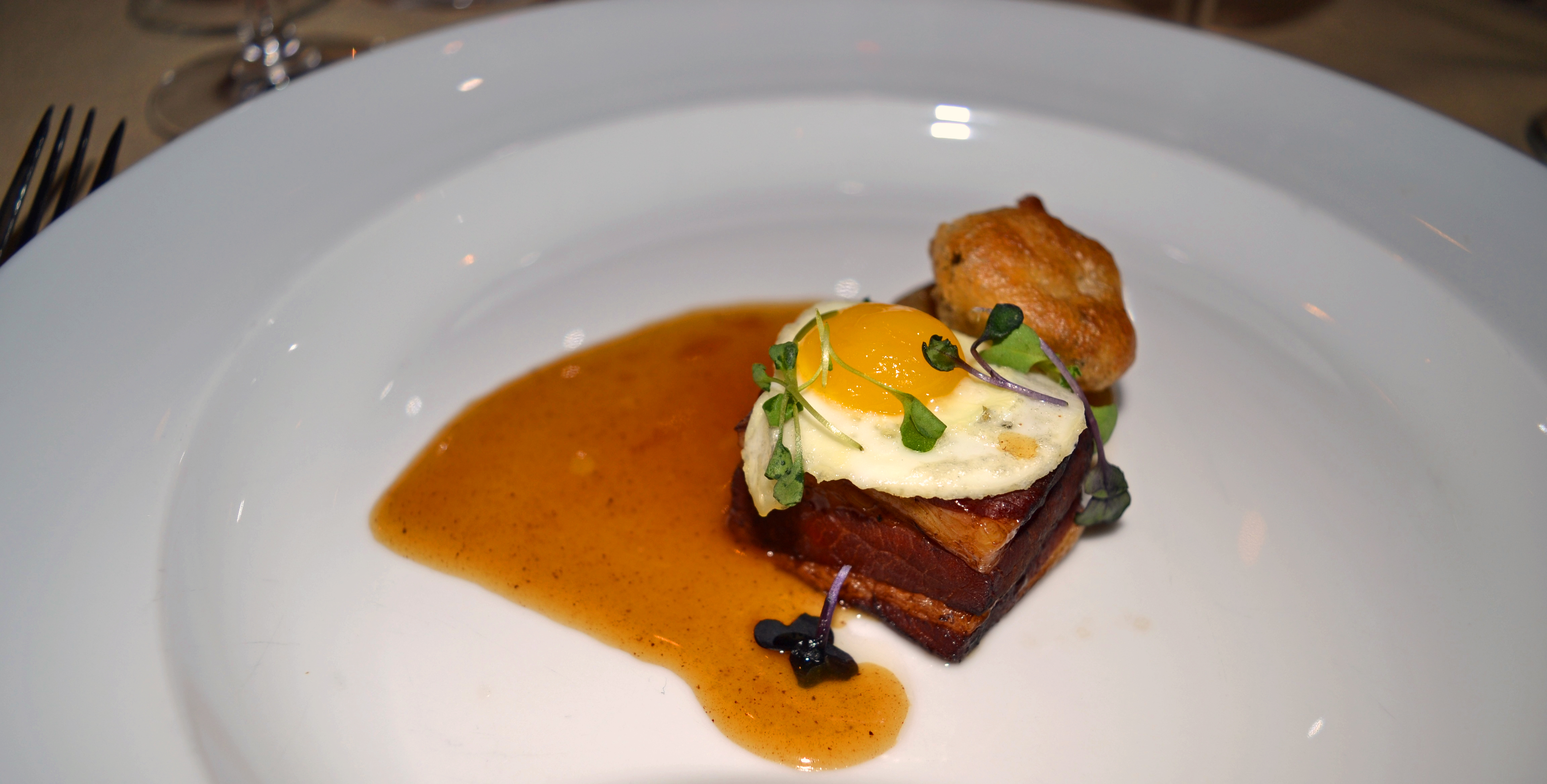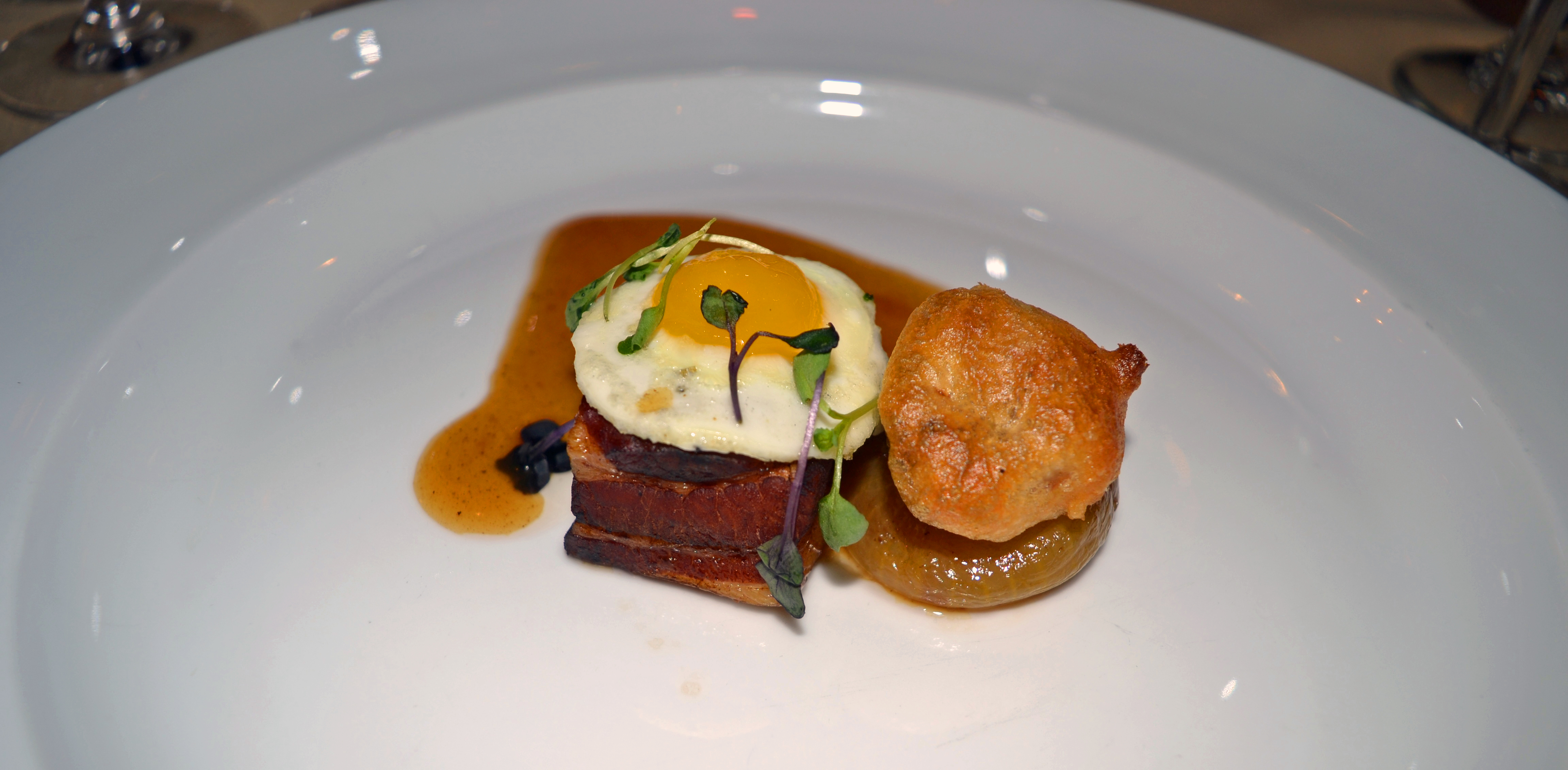 Sakura Pork Belly with Aux Champignon Crispy Wild Quail Egg.
