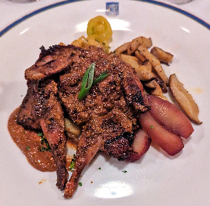 Grilled Quail, maple pecan glaze, wilted frisée, shiitake, sherry poached gala apple: